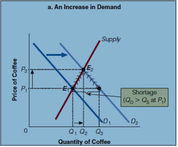 An increase of demand causes a shortage until equilibrium is reached at a higher price and quantity.