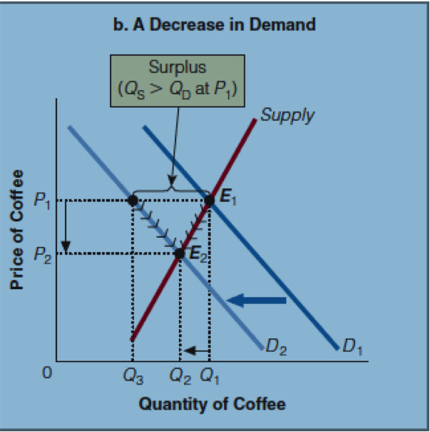When there is a decrease in demand, there is a surplus. The excess goods decrease the price until a new equilibrium is reached.