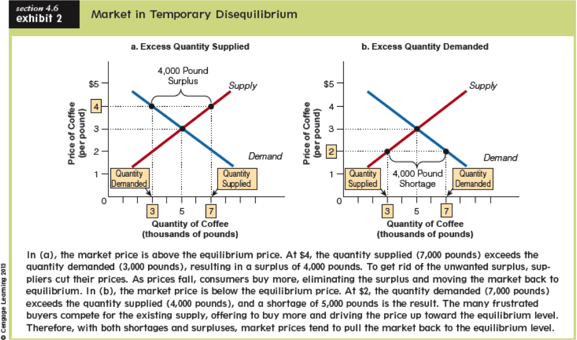 Equilibrium is the point at which the demand and supply curve meet. If the market price is above this, there is a surplus. If it is below there is a shortage. Eventually the shortage and surplus will decrease and go back to equilibrium.