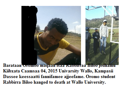 Widespread brutalities of the Ethiopian Government in handling protests in different parts of the state of Oromia by peaceful demonstrators » Health Science 1st year Oromo student Rabbirra Biloo hanged to death at Wallo University on May 4, 2015