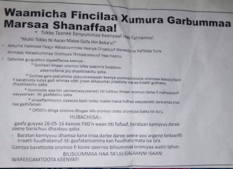 Oromia: #OromoProtests: Gabaasa Fincila Xumura Garbummaa (FXG) Oromiyaa 2016 (May) » waamicha fincila xumura garbummaa marsaa shanaffaa, Caamsaa 26 bara 2016