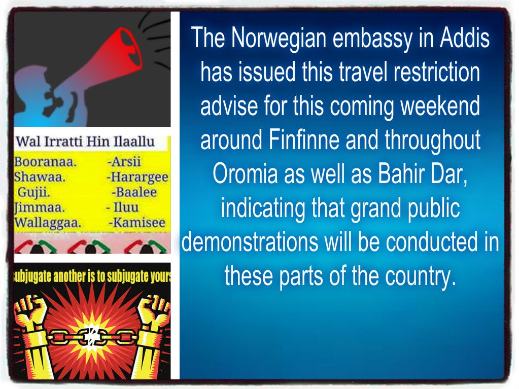 Oromia: #OromoProtests: Gabaasa Fincila Xumura Garbummaa (FXG) Oromiyaa 2016 (August) » Grand #OromoProtests on August 6, 2016, Norwegian Embassy in Finfinnee, travel restrictions