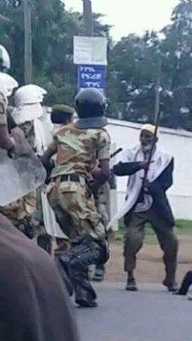 Oromia: #OromoProtests: Gabaasa Fincila Xumura Garbummaa (FXG) Oromiyaa 2016 (August) » #OromoProtests, an Oromo man, 80 years old confronting fascist Ethiopia’s regime, Agazi forces, Arsi, Oromia, 12 August 2016
