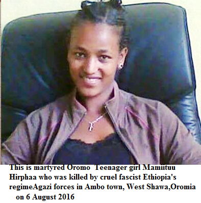 Oromia: #OromoProtests: Gabaasa Fincila Xumura Garbummaa (FXG) Oromiyaa 2016 (August) » This is martyred Oromo teenager girl Mamiituu Hirphaa who was killed by cruel fascist Ethiopia’s regime Agazi forces in Ambo town, West Shawa, Oromia on 6 August 2016
