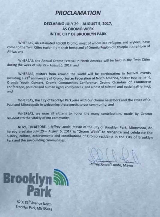 To acknowledge the growing importance of the Oromo people in the three cities, the mayors have officially declared July 29 – August 5, 2017 “Oromo Week”.