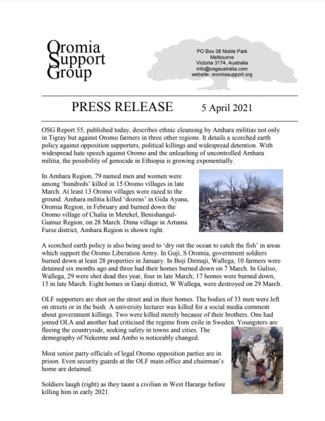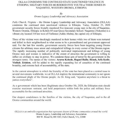 Press Release (Oct. 23, 2020): OLLAA CONDEMNS THE CONTINUED STATE SANCTIONED VIOLENCE IN ETHIOPIA: MILITARY FORCES MURDERED FIVE YOUTH at THEIR HOMES IN NAQAMTEE, WESTERN OROMIA, ETHIOPIA October 24, 2020