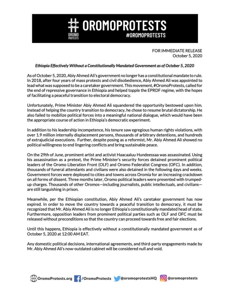#OromoProtests: PRESS RELEASE: As of today, October 5, 2020, at 12:00 AM Eastern Africa Time, Ethiopia is effectively without a constitutionally mandated government. October 5, 2020
