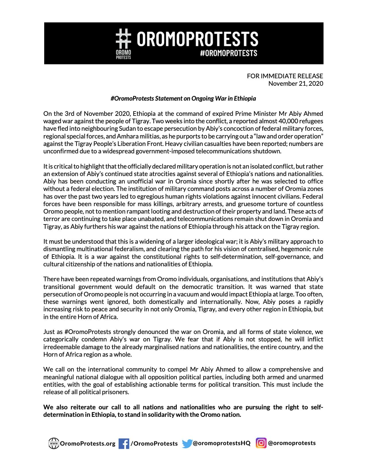 #OromoProtests Statement on Ongoing War in Ethiopia November 22, 2020