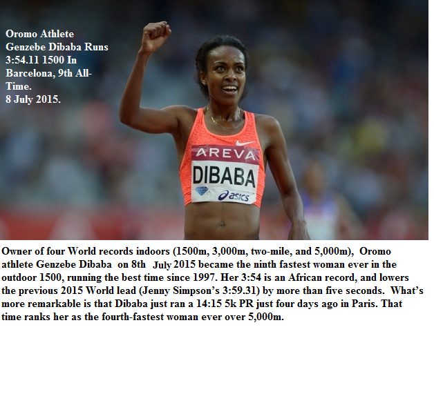Younger sister of Tirunesh Dibaba, 24-year-old Oromo athlete Genzebe Dibaba – also hailing from Bekoji, Oromia – won the Diamond League 5K Meet in Oslo, Norway, on June 11, 2015. Among others, she was also cheered by her Oromo supporters in Norway. Oromo athletes Sinbiree and Galate Burqa completed 2nd and 4th respectively.