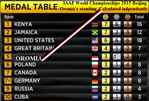 IAAF World Championships 2015 in Beijing, China: Oromo athletes medal gains Calculated Independently. According to the calculations Oromia stands 5th in the world and 2nd to Kenya in Africa.