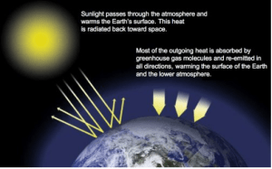 The primary cause is the emission of greenhouse gases into the atmosphere, mostly carbon dioxide, which form a blanket that traps heat at the Earth’s surface.
