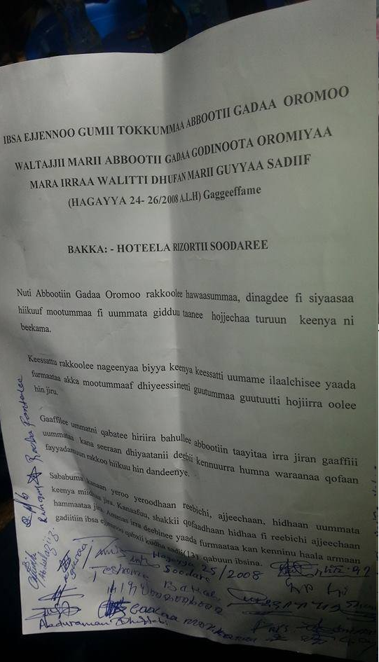 Issued following the conclusion of a three day extraordinary assembly held from 30 August- 1st September 2016 by Abba Gaddas representing all Oromia provinces