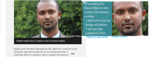 On May 25, Yonatan Tesfaye was sentenced to six years and three months in prison for “inciting” antigovernment protests in nine Facebook updates.